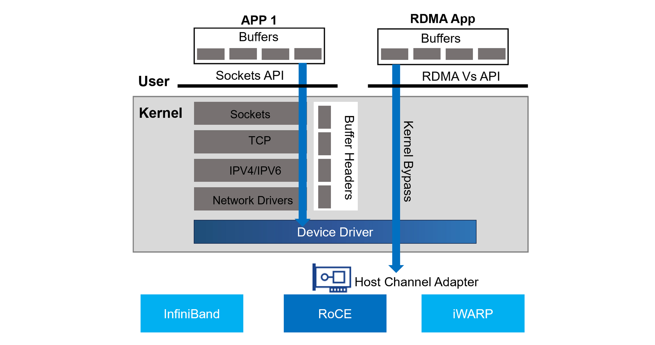 The RDMA application on the right, however, makes use of RDMA. This allows it to bypass the kernel and device driver and send the traffic out the HCA without involving the CPU.
