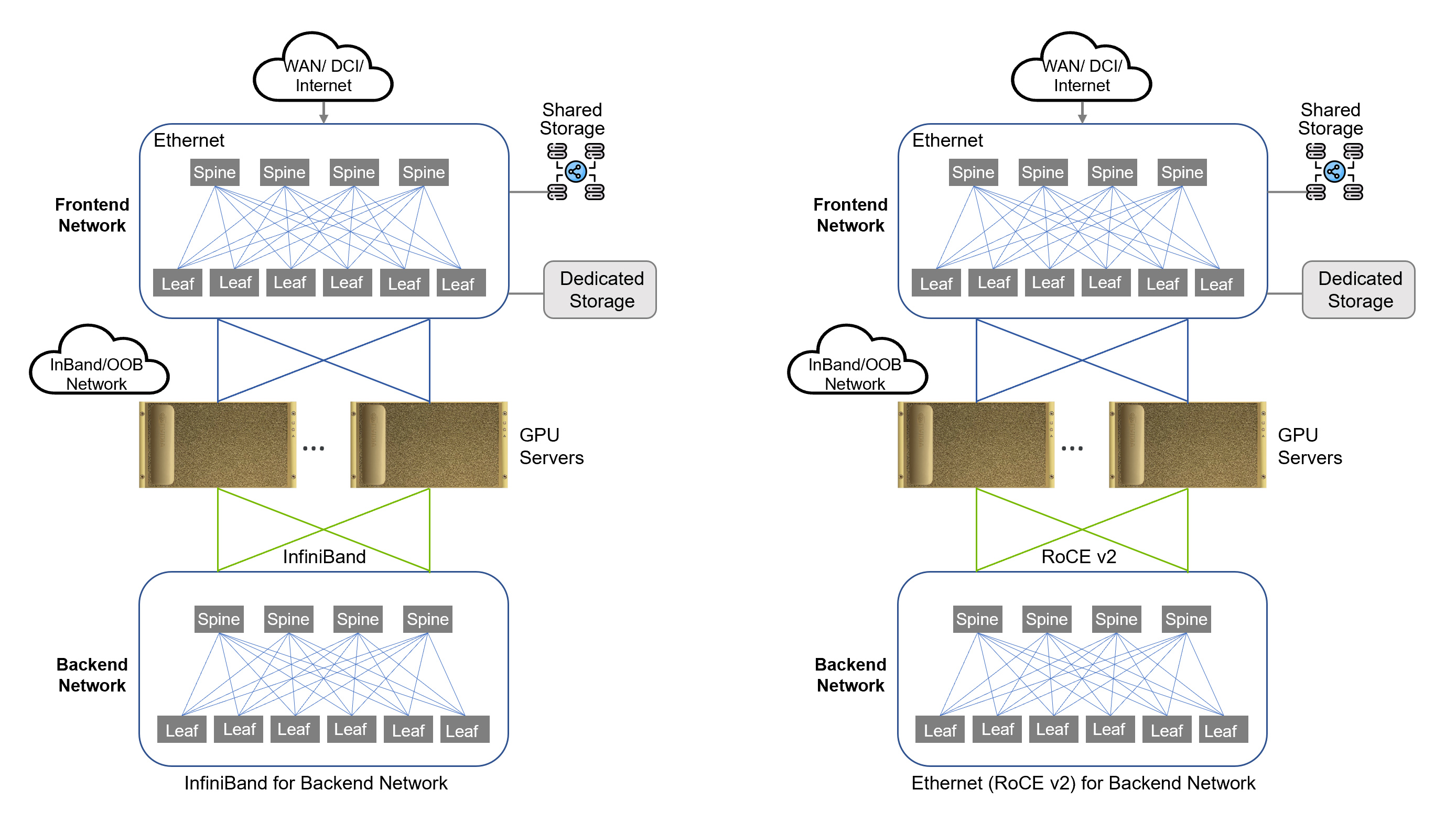 The frontend network serves as the entry point into your AI cluster. The frontend network typically does not transport RDMA traffic, therefore this network is usually a traditional Ethernet segment. Since the frontend network is utilized for external storage and AI Inferencing traffic, this network still requires high throughput and low latency.